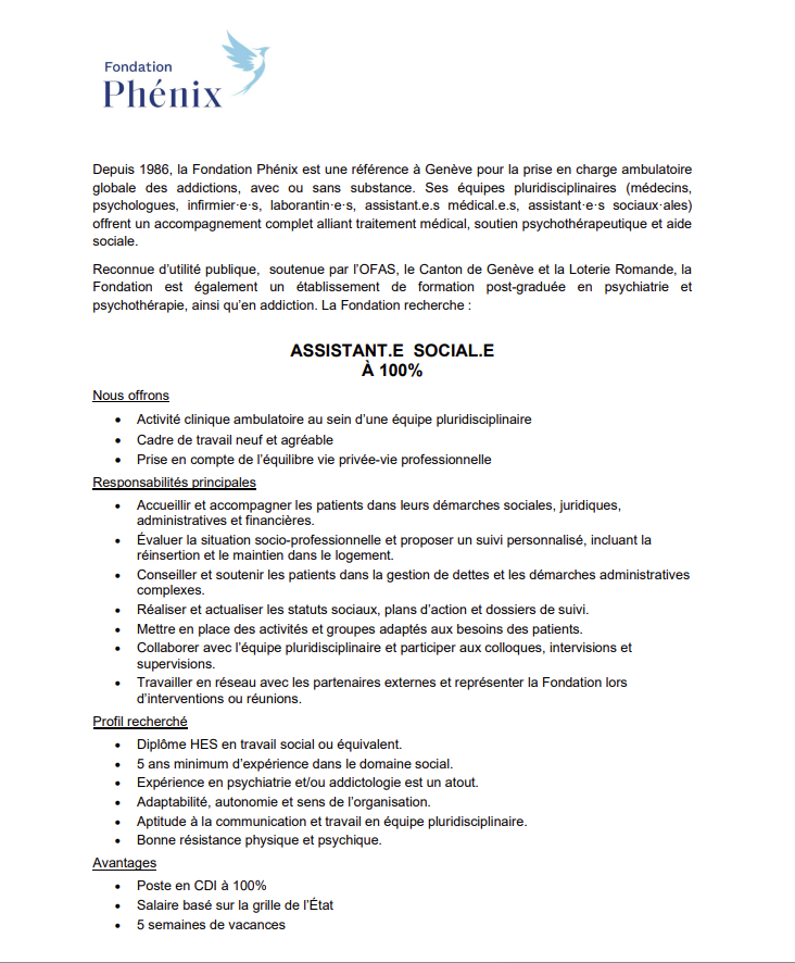 POSTES À POURVOIRAU SEIN DE LA FONDATION PHÉNIX Bienvenue sur la page « Emploi » de la Fondation Phénix! Assistant·e social·e à 100 %